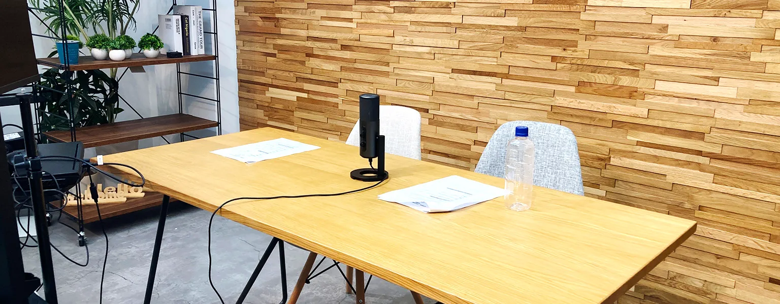 白壁とウッドパネル、2つの異なる雰囲気の背景を使い分けて撮影が可能。扉は防音仕様で、音の気になるシーンでも安心してご利用いただけます。